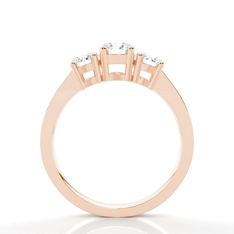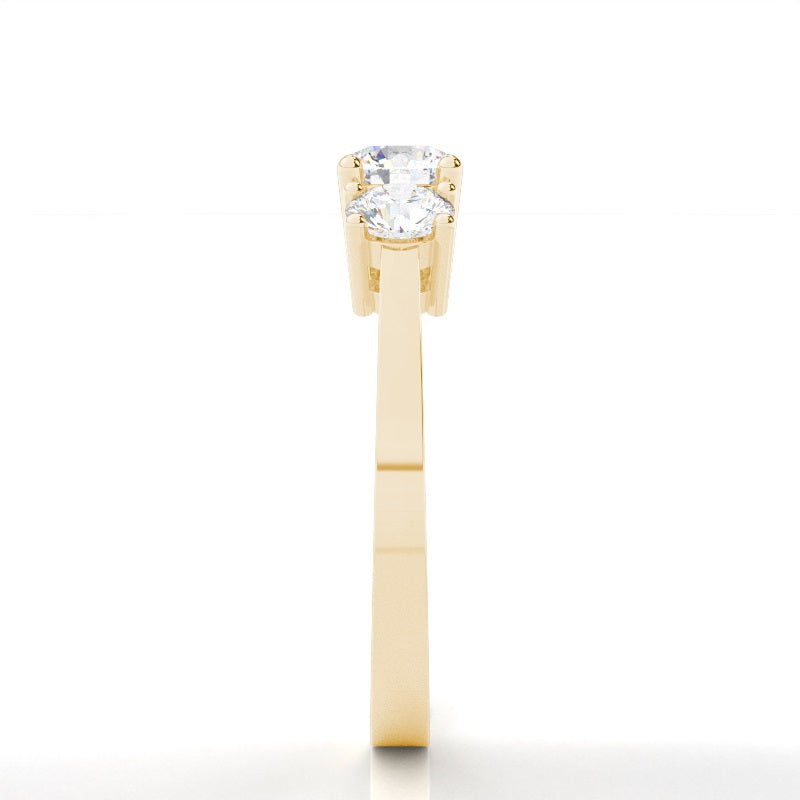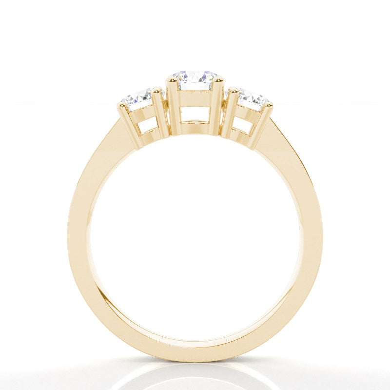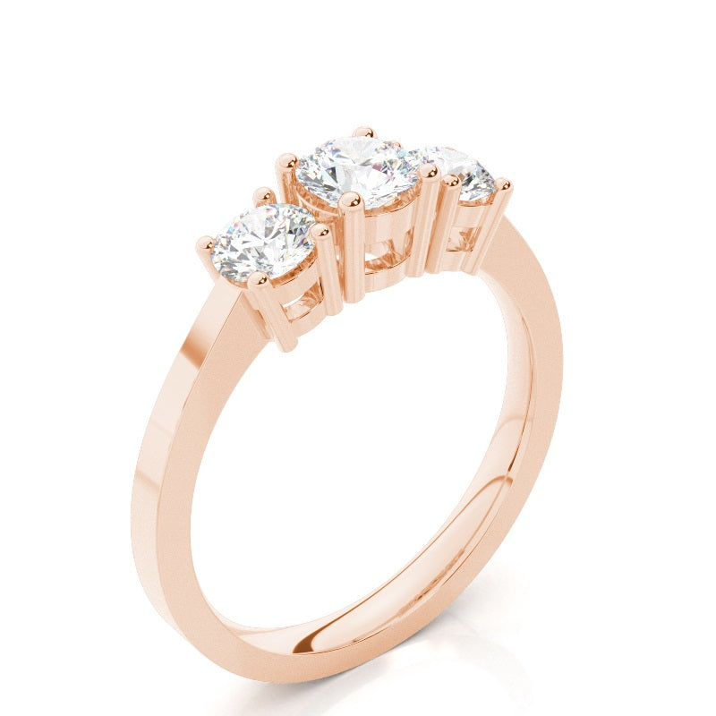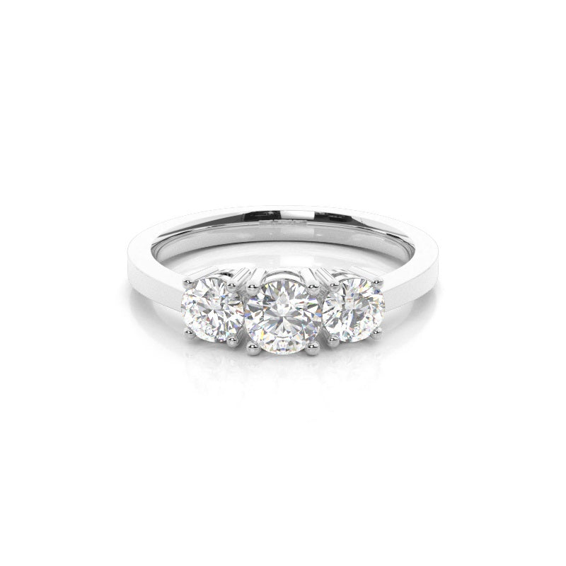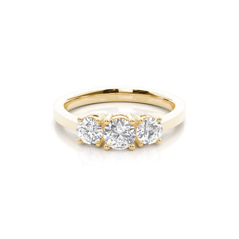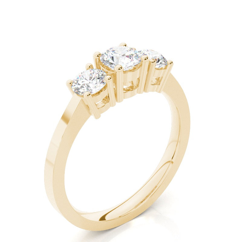 Discover our Prong Trilogy in Gold, with 0.310 ct.wt. EF, VVS-VS Round Lab-Created Diamond The symbolism in a trinity ring is hard to miss. In this three stone engagement ring, the three dazzling round shaped diamonds sit side by side to represent past, present and future of your conjugal journey. The four prong setting design allows for the stones to give of cheerful radiance.