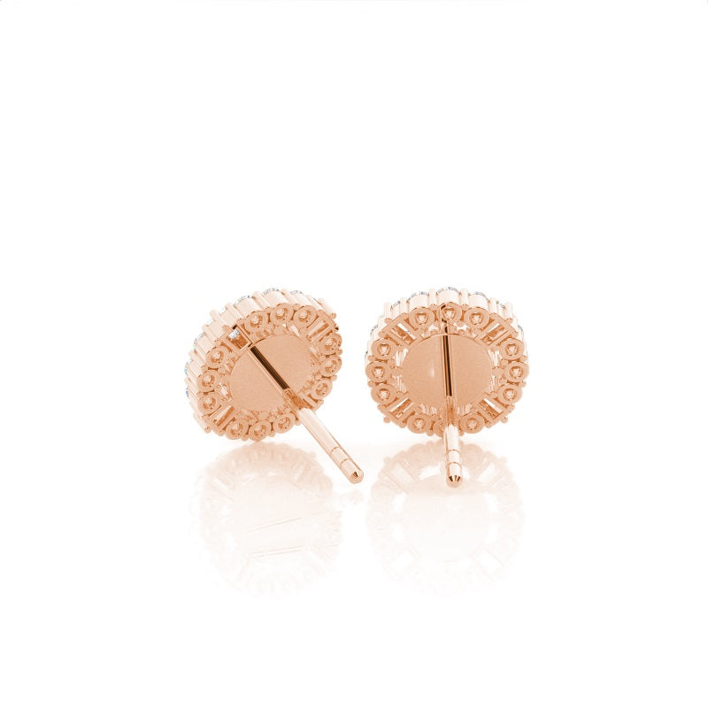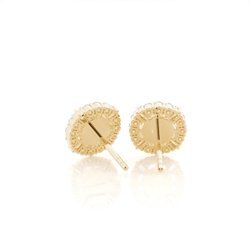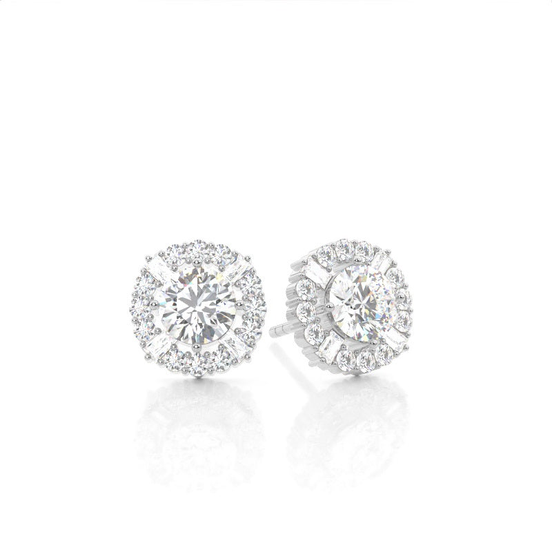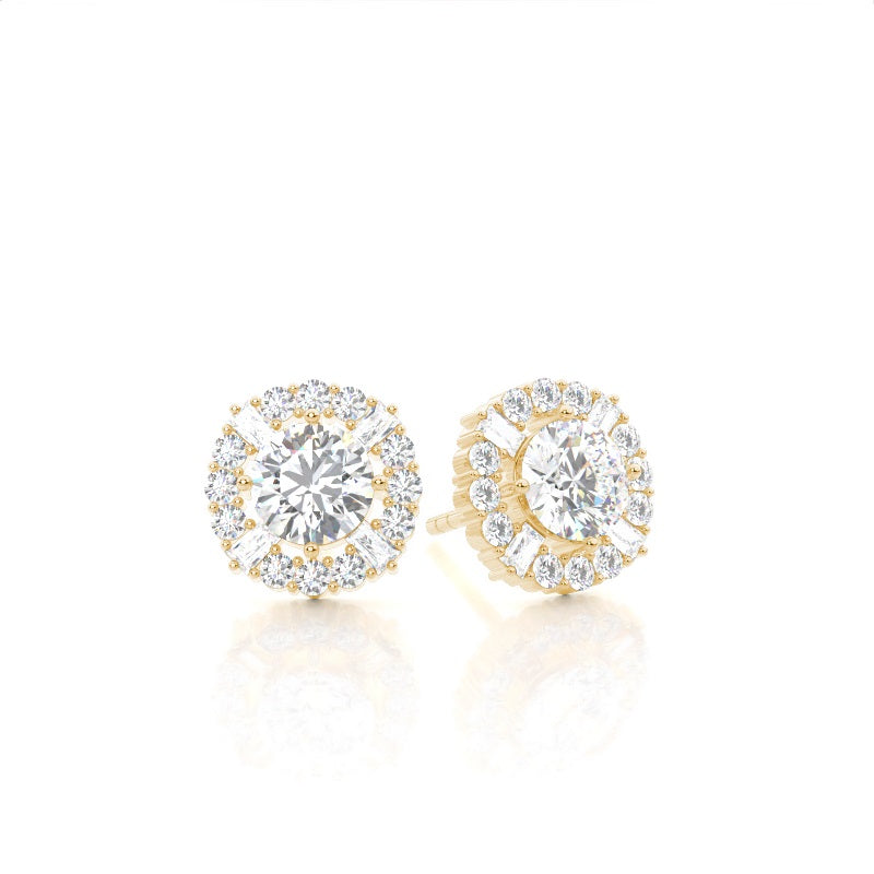 Discover our 4 Prong Halo Diamond Earrings in Gold, with Center Stone of 0.700 ct.wt. EF VS Round Lab-Created Diamond and side stone of approx.. 0.248 ct.wt. Baguette,Round EF