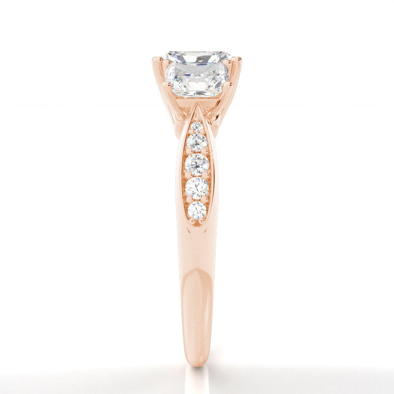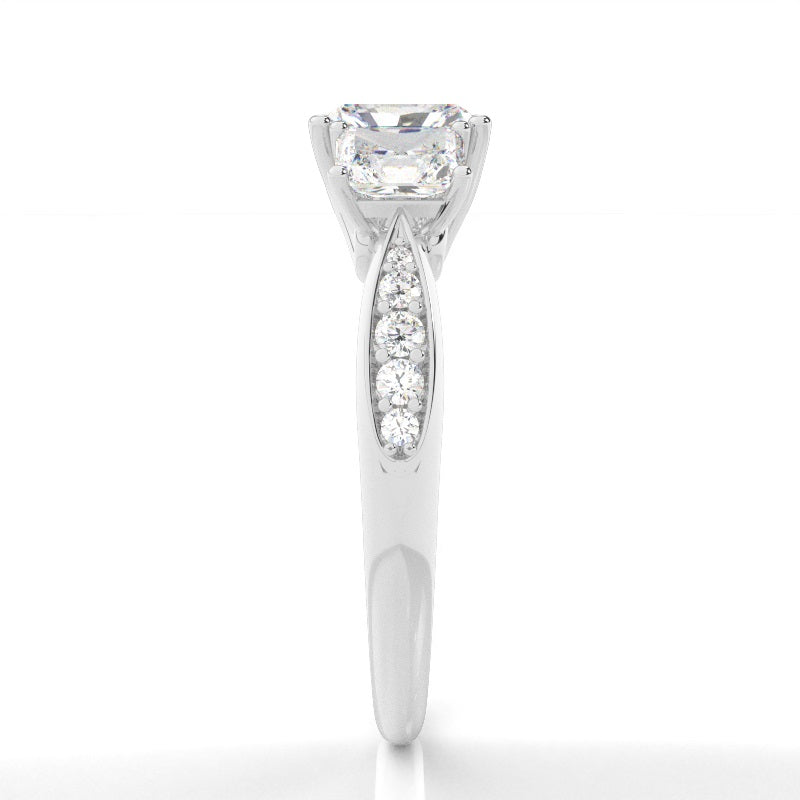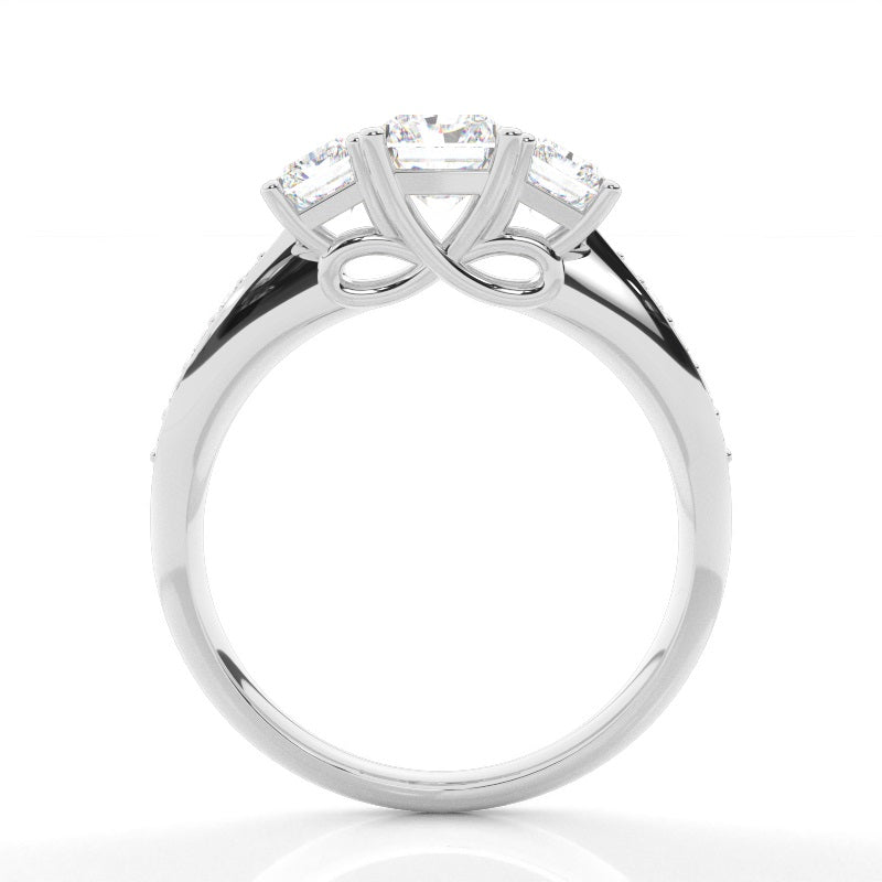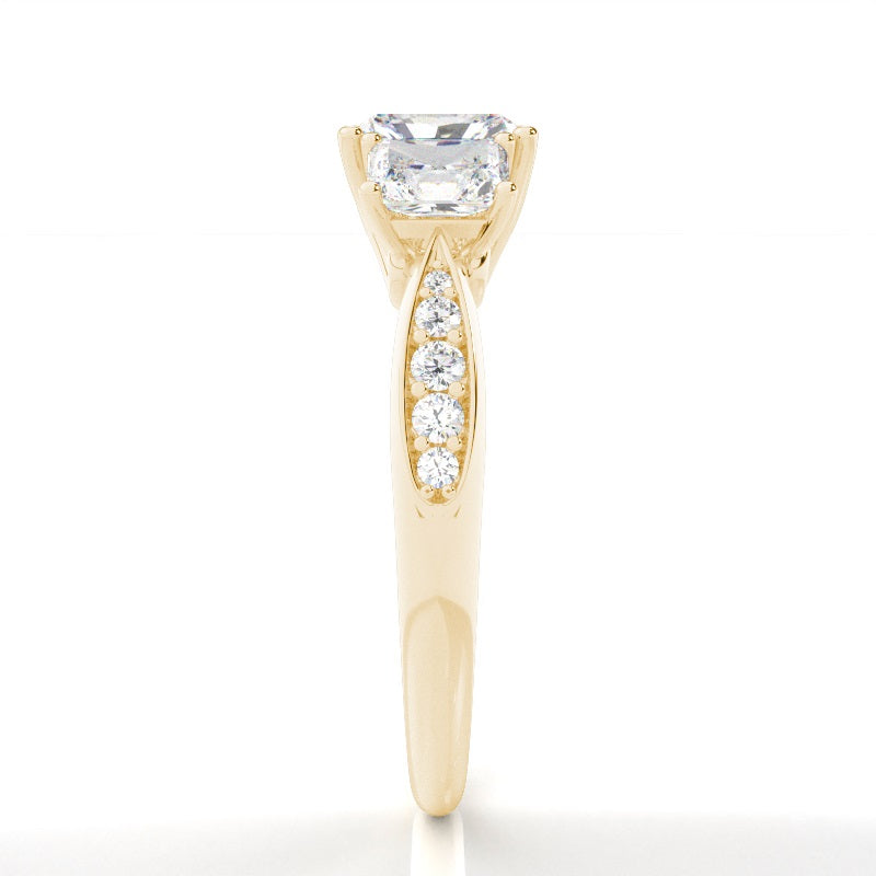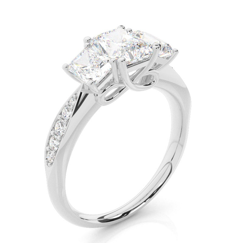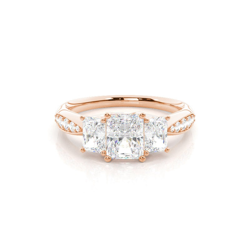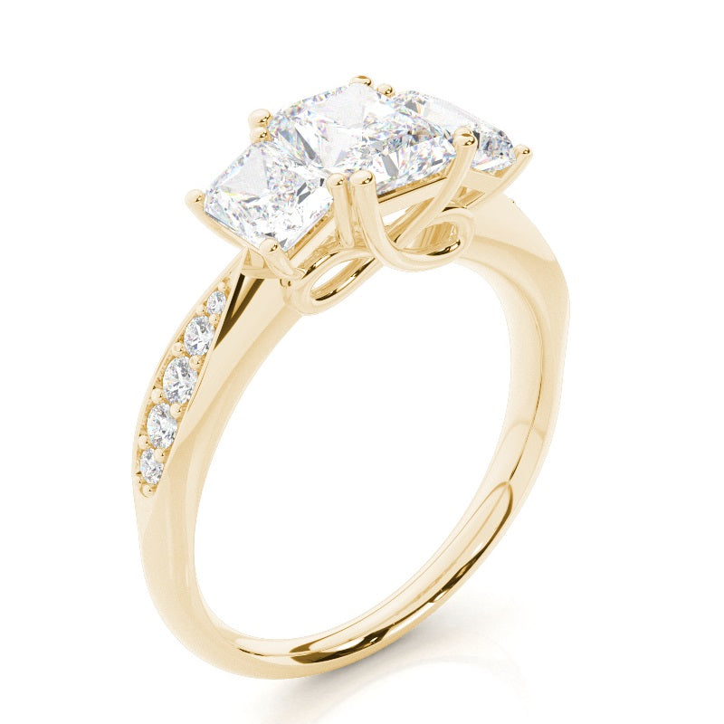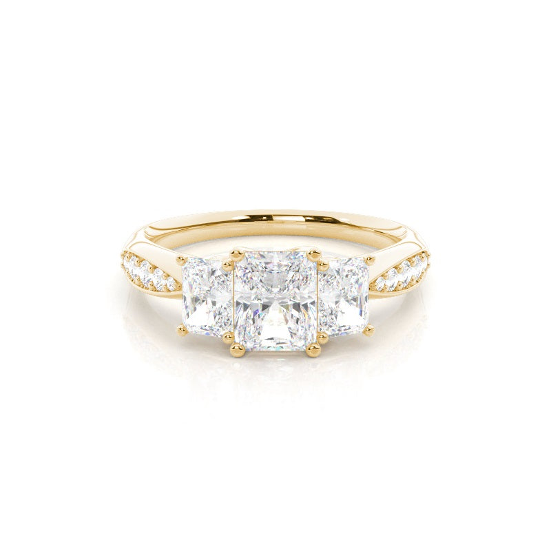 Discover our 4 Prong Trilogy in Gold, with a Radiant Lab-Created Diamond and aprox. 0.136 ct.wt. Round EF