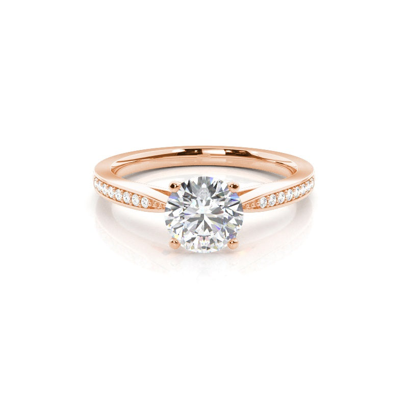 Discover our Prong Side Stone in Gold, with a Round Lab-Created Diamond and side stone of aprox. 0.110 ct.wt. Round F-G The cut, clarity and craftsmanship, if you are looking for these three in your engagement ring then this is the ideal choice. It has an ornate four prong setting holding the diamond very firmly with medium side stones giving the ring a special effect.