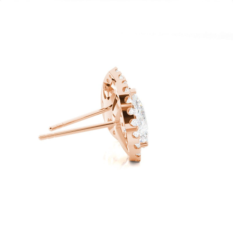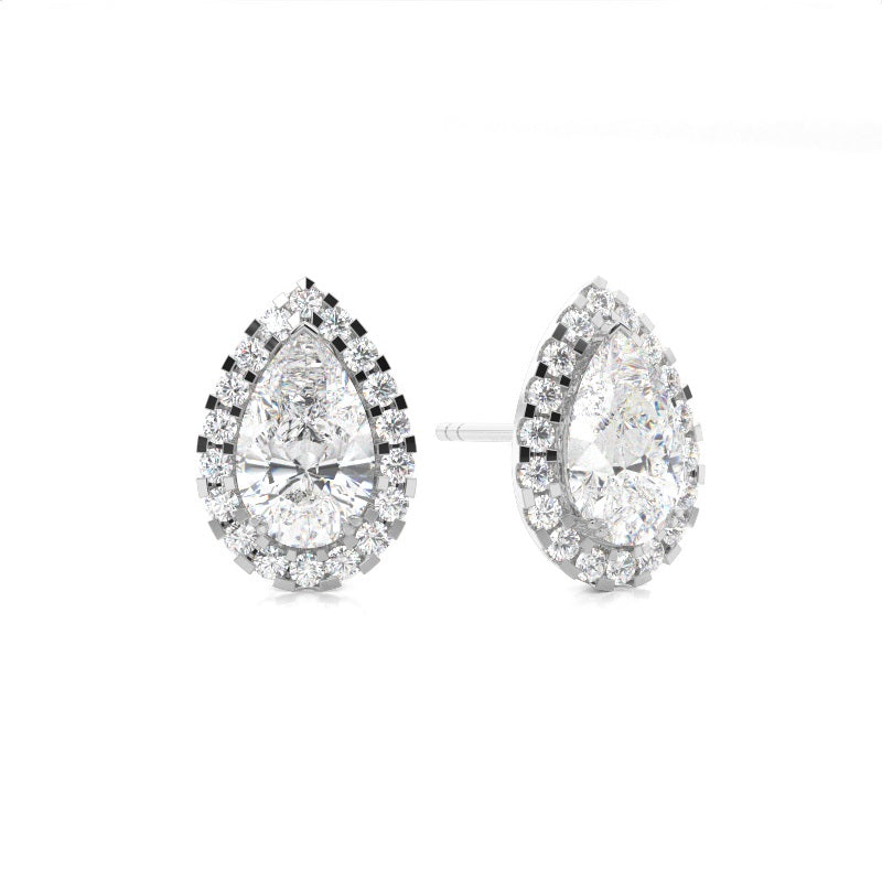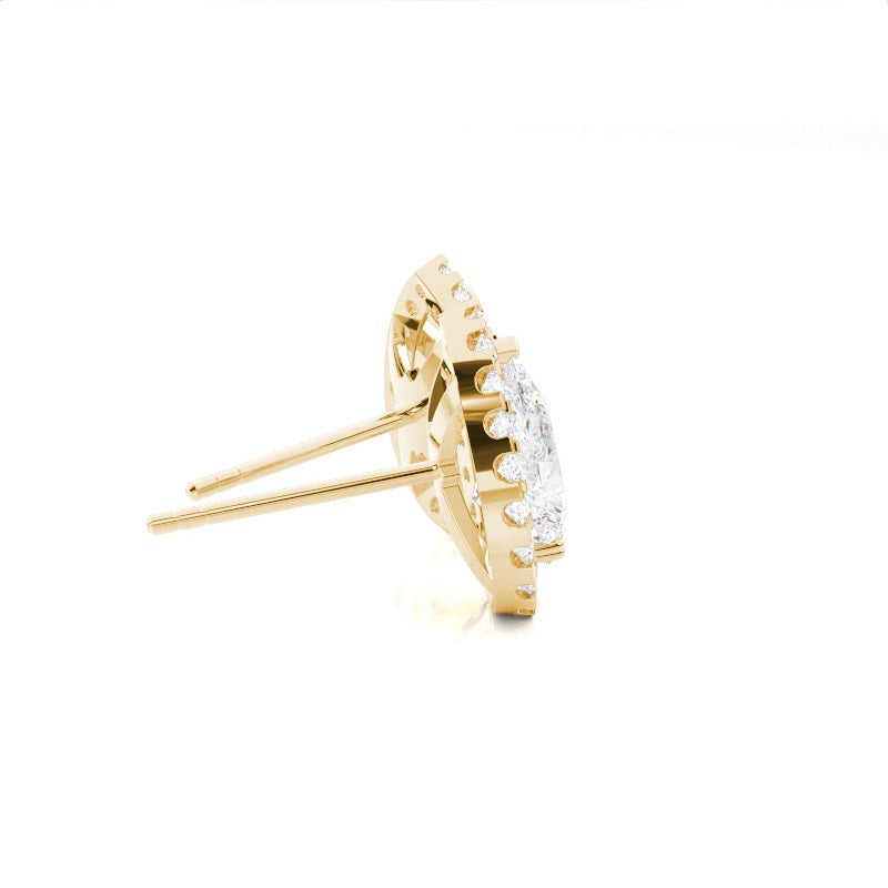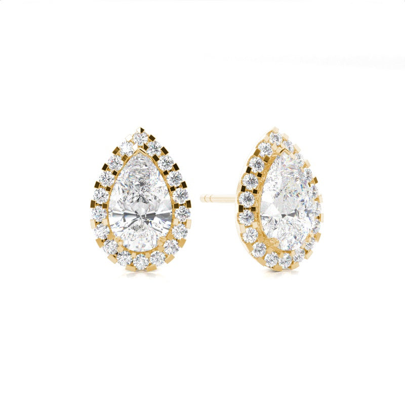 Discover our 3 Prong Halo Diamond Earrings in Gold, with Center Stone of 0.400 ct.wt. EF VVS-VS Pear Lab-Created Diamond and side stone of aprox. 0.400 ct.wt. Round EF
