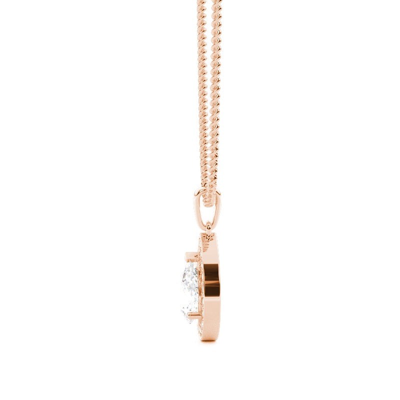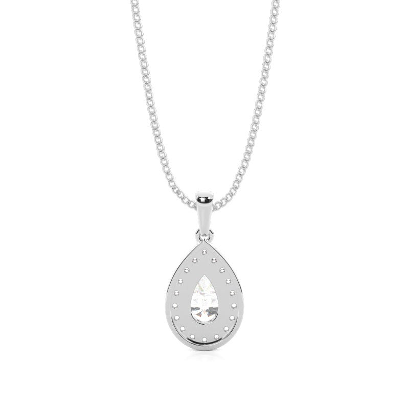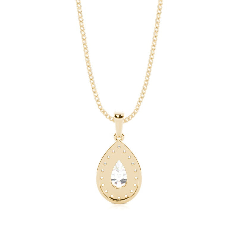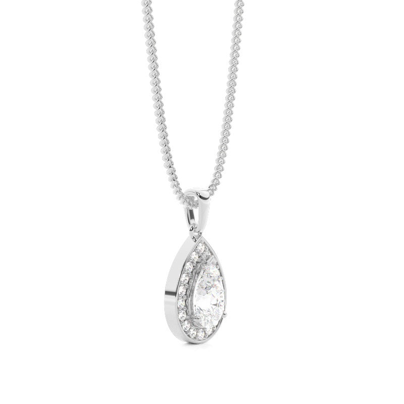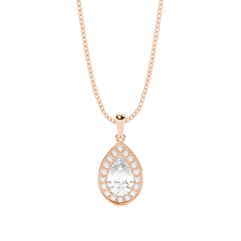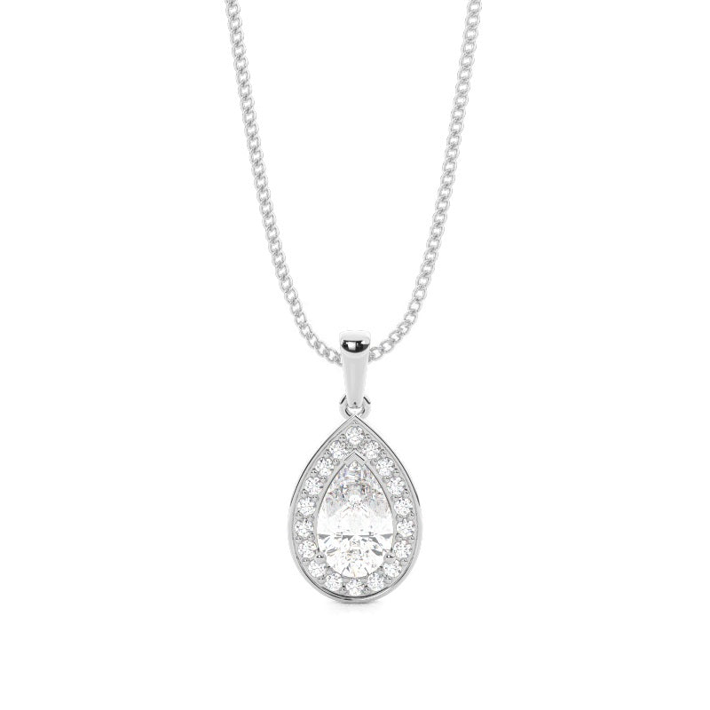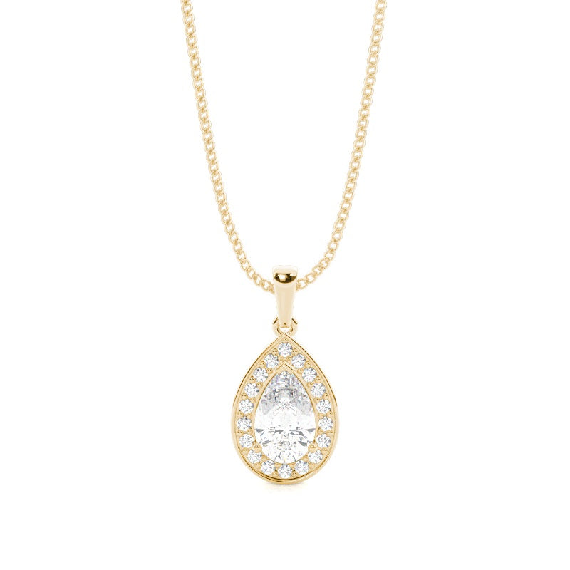 Discover our 3 Prong Halo Pendant in Gold, with Center Stone of 1.000 ct.wt. EF VVS-VS Pear Lab-Created Diamond and side stone of approx. 0.180 ct.wt. Round EF