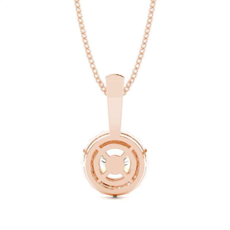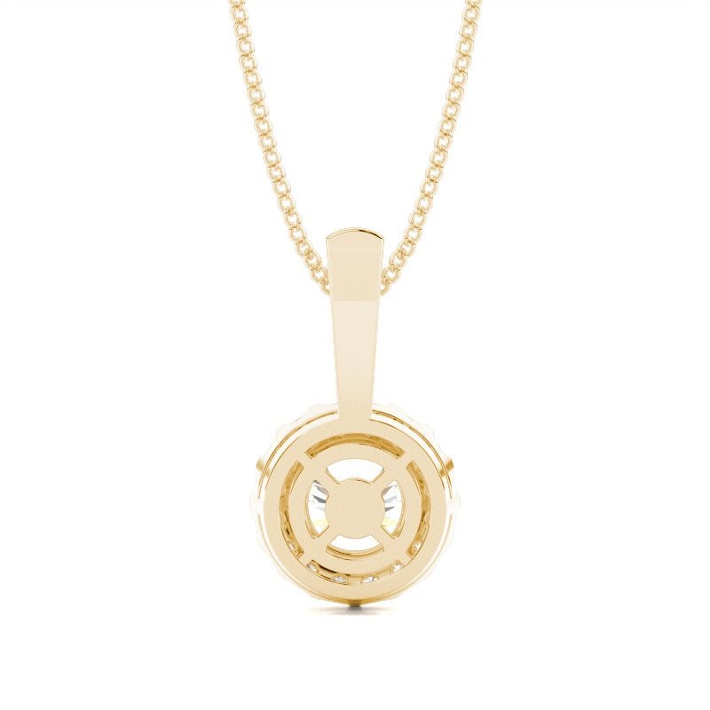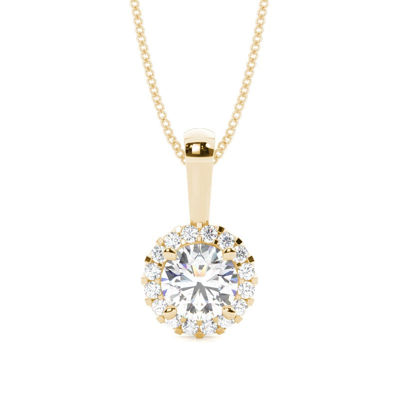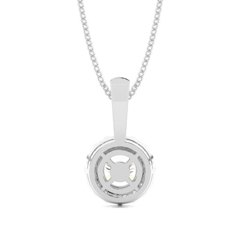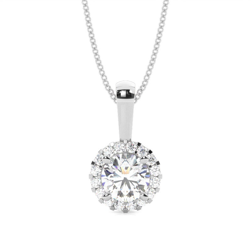 Discover our Prong Halo Pendant in 9K White Gold, with Center Stone of 0.200 ct.wt. G VS Round Lab-Created Diamond and side stone of aprox. 0.104 ct.wt. Round F-G You'll have natural elegance when wearing this diamond halo pendant. Here is a round diamond pendant with once central diamond with beautiful round brilliant diamonds elegantly set in a halo surrounding it. It sparkles and shimmers beautifully on any chain.
