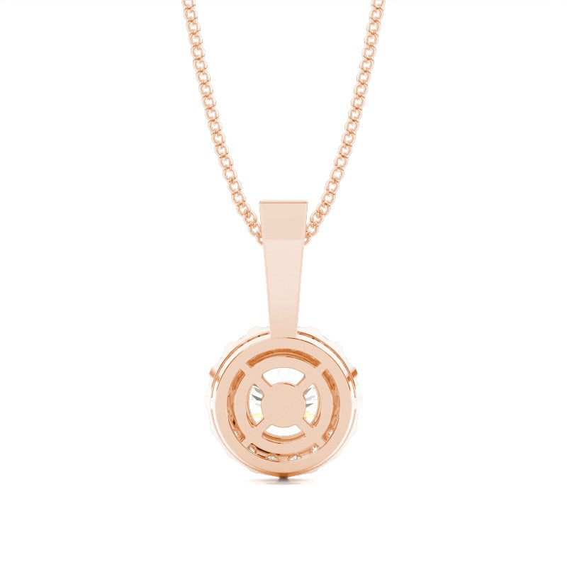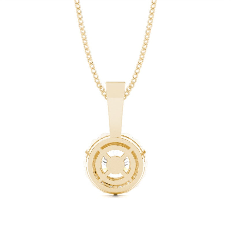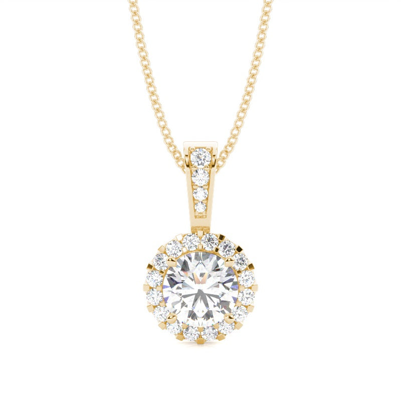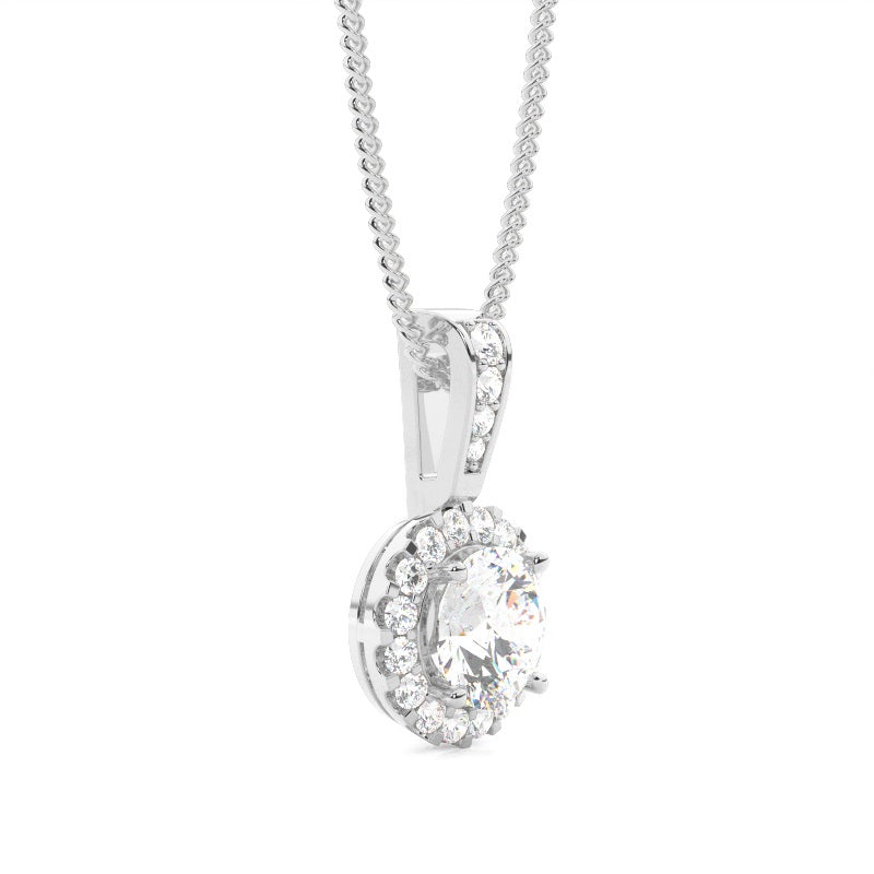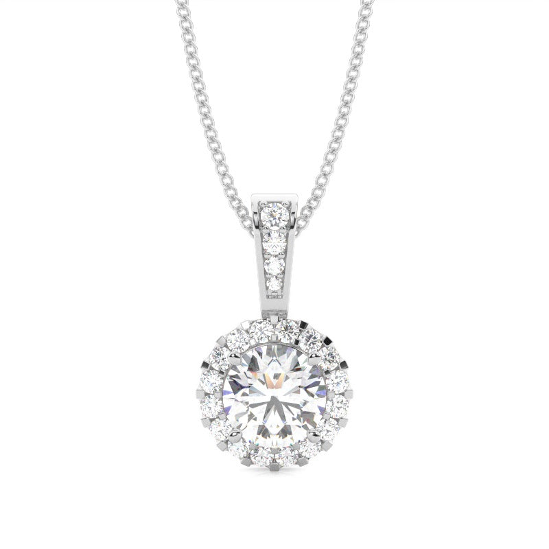 Discover our Prong Halo Pendant in 18K White Gold, with Center Stone of 0.200 ct.wt. G VS Round Lab-Created Diamond and side stone of aprox. 0.135 ct.wt. Round F-G You'll have natural elegance when wearing this diamond halo pendant. Here is a round diamond pendant with once central diamond with beautiful round brilliant diamonds elegantly set in a halo surrounding it. It sparkles and shimmers beautifully on any chain.