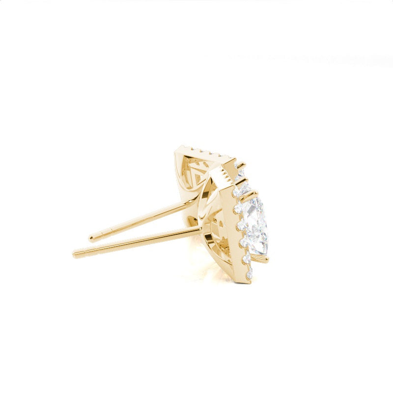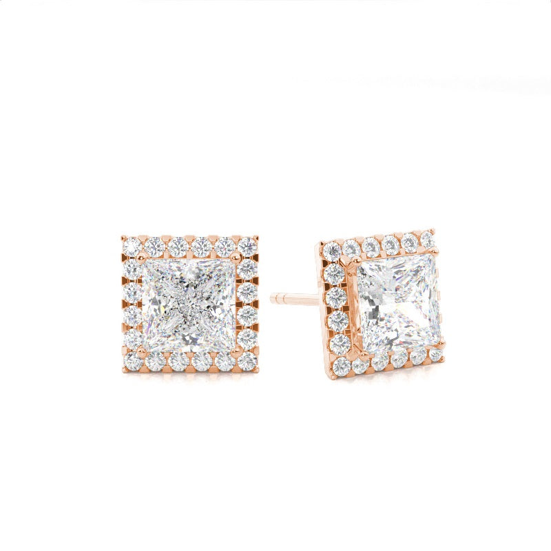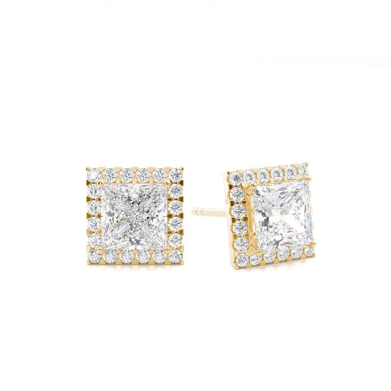 Discover our Prong Halo Diamond Earrings in Gold, with Center Stone of 0.400 ct.wt. EF VVS-VS Princess Lab-Created Diamond and side stone of aprox. 0.128 ct.wt. Round EF If you are looking for a perfect wedding or anniversary gift for your sweetheart then this 4 prong setting diamond stud Earrings is a perfect choice. The halo design of this Earrings make the diamonds look larger. And as a result her ears will look more prominent and draw attention of everyone.
