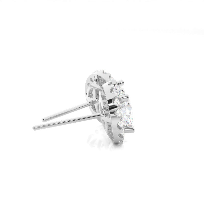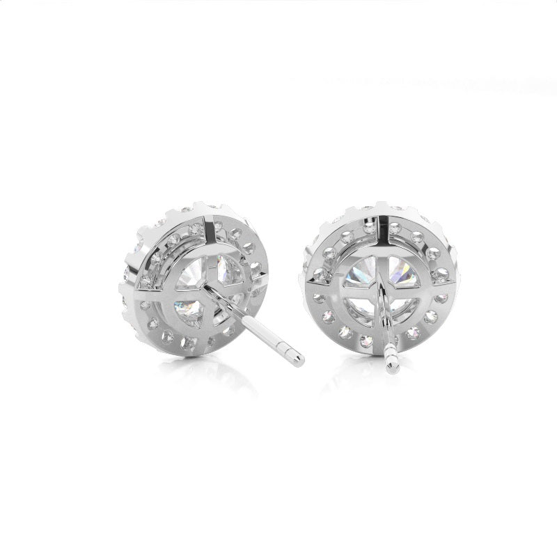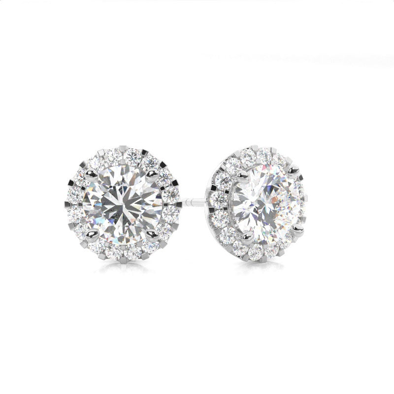 Discover our 4 Prong Halo Diamond Earrings in Gold, with Center Stone of 0.200 ct.wt. G VS Round Lab-Created Diamond and side stone of aprox. 0.140 ct.wt. Round F-G With these contemporary diamond halo Earrings you will have natural classic elegance. Set with a round brilliant diamond in the centre and a round diamond-set halo around it you are sure to have stunning shine and sparkle that makes a statement.