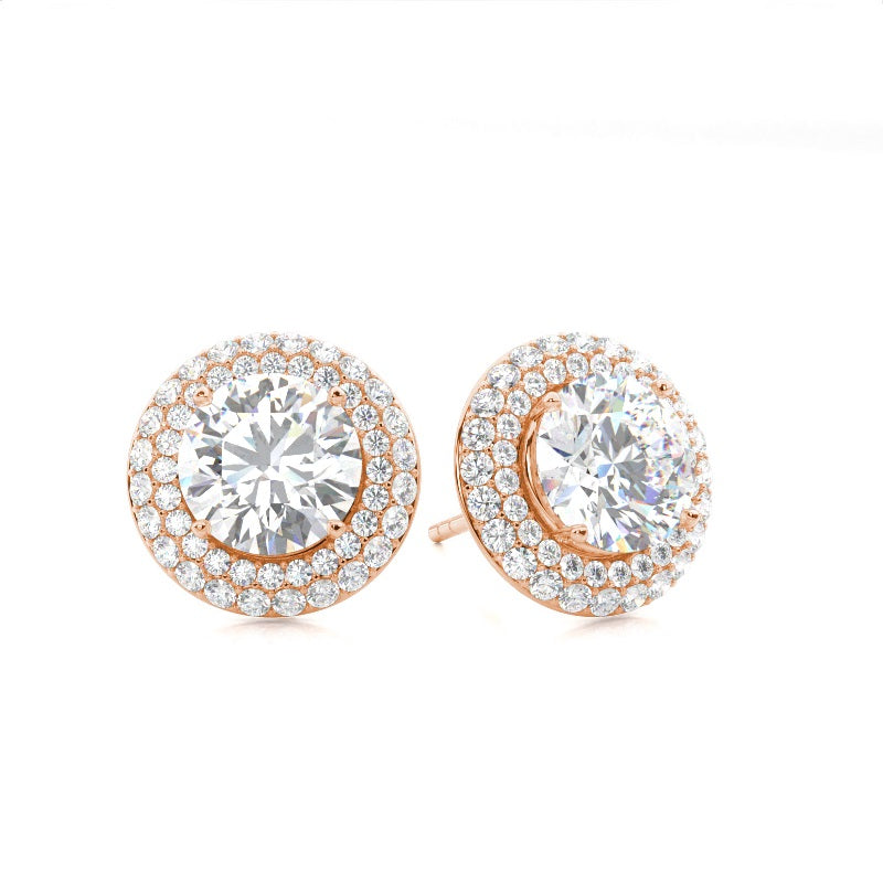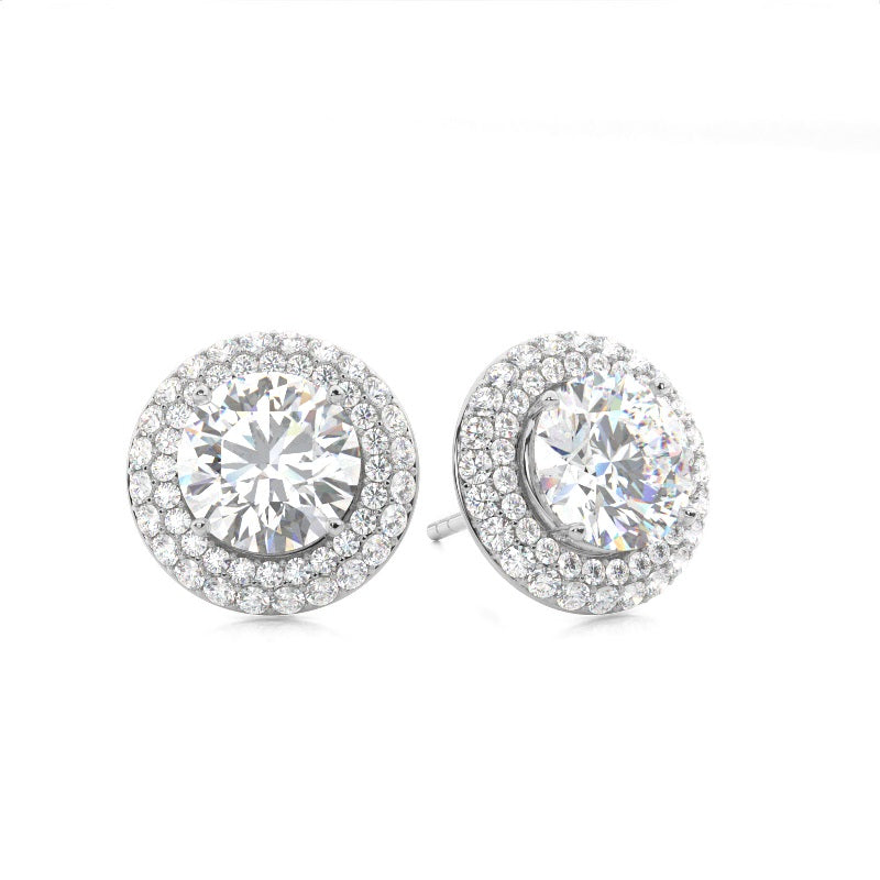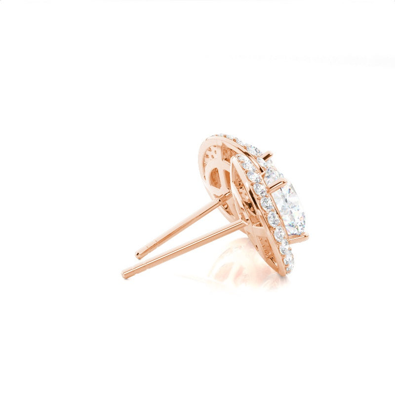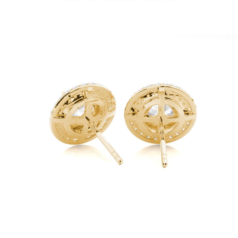 Discover our 4 Prong Halo Diamond Earrings in Gold, with Center Stone of 0.400 ct.wt. G VS Round Lab-Created Diamond and side stone of aprox. 0.420 ct.wt. Round F-G This four prong setting round cut halo stud Earrings can transform your style from simple to elegant beauty. The diamond in the center dazzles in pristine radiance.